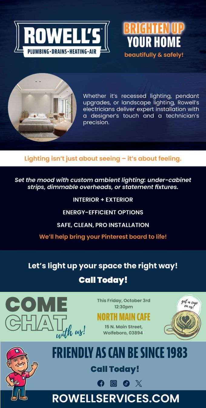 "Friendly As Can Be Since 1983!" When you need help with your plumbing, drains, heating, cooling or electrical in Moultonborough, you can always rely on Rowell's Services! Call us now or book online!
